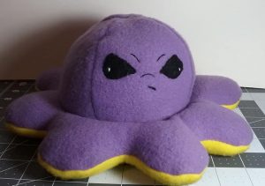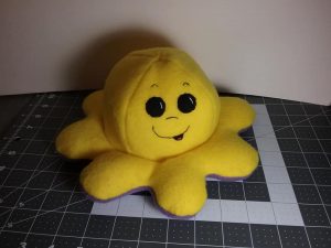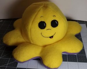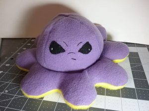 This is a reversible Octopus toy. It’s made using fleese so it’s very soft to the touch. The little face is made using black fleese for the eye shape and black embroidery stitches. I made this one angry on one side, flip it over and it’s happy.