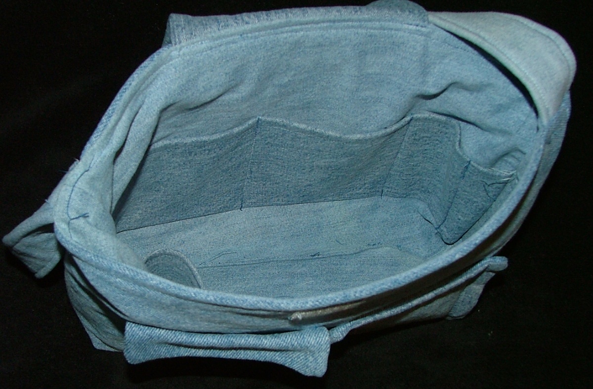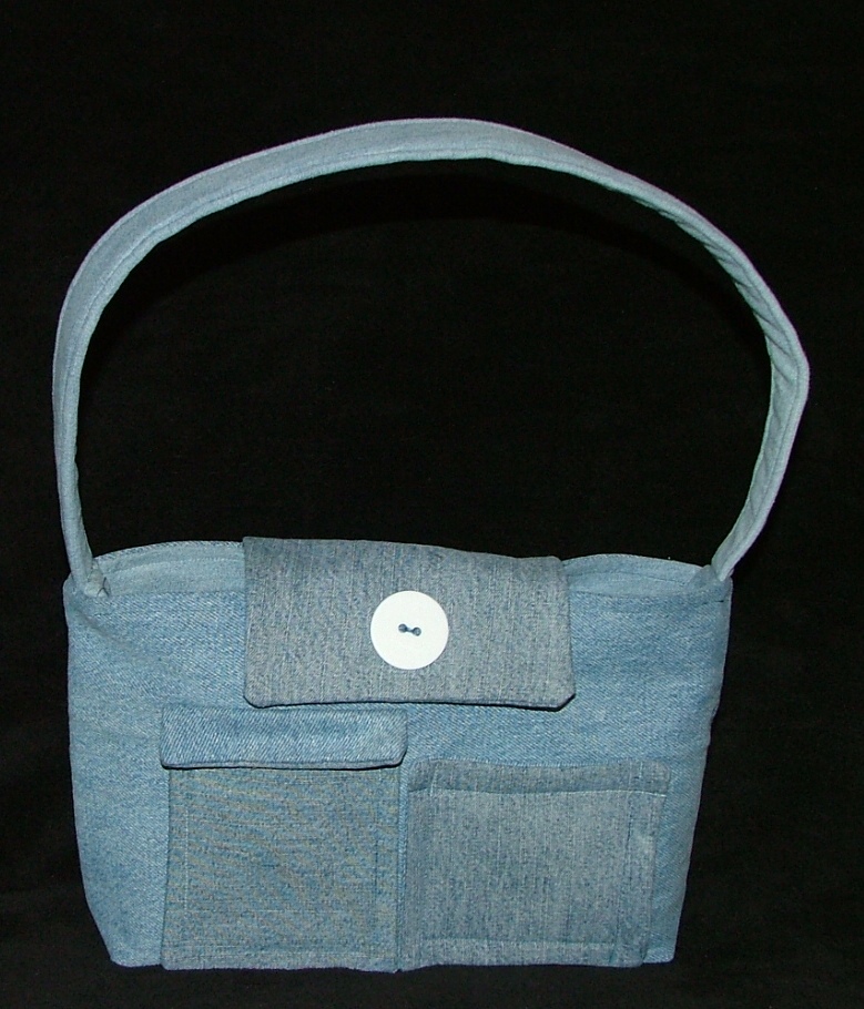 I finished my new purse. I made it out of old jeans. I was given a box full of them a couple of months ago and hadn’t done anything with them until tonight. Even the button was a “used” one that I took off something else a long time ago.