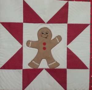 The top row, center gingerbread block. In addition to the normal cotton fabrics you will also need batting, rick rack and a fine point permanent marker for the face unless you want to embroider the face, the you will need embroidery floss and a handsewing needle.